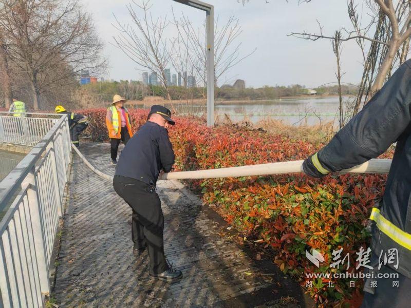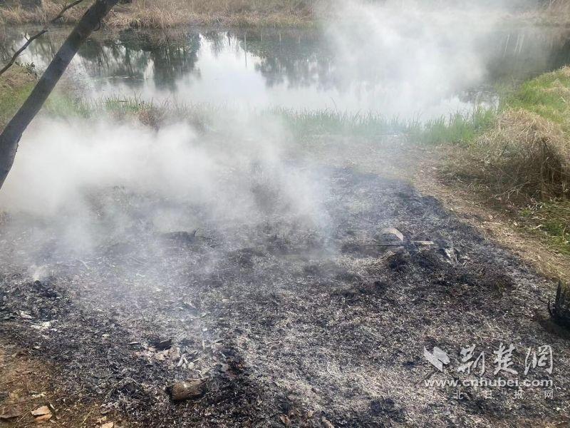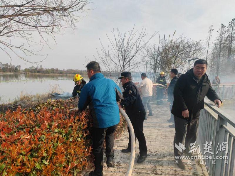 當(dāng)日下午,東湖風(fēng)景區(qū)城管執(zhí)法局四中隊(duì)隊(duì)員王建偉、宋威、劉鑫宇在九女墩附近巡查時(shí),發(fā)現(xiàn)華僑城運(yùn)動(dòng)中心南山草木集門店附近有濃煙升起。他們迅速趕到現(xiàn)場(chǎng),發(fā)現(xiàn)起火點(diǎn)為門店下方野塘中的蘆葦和干草,起火原因不明。由于野塘地勢(shì)復(fù)雜,無法直接取水滅火,現(xiàn)場(chǎng)情況較為緊急。