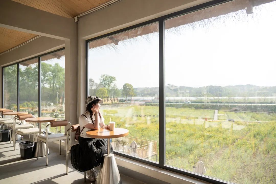 靠窗的吧臺(tái)也十分吃香,時(shí)不時(shí)有年輕的女孩端起咖啡,輪番坐上吧臺(tái)椅拍照,背景是屋外的稻田與花海,非常“出片”。