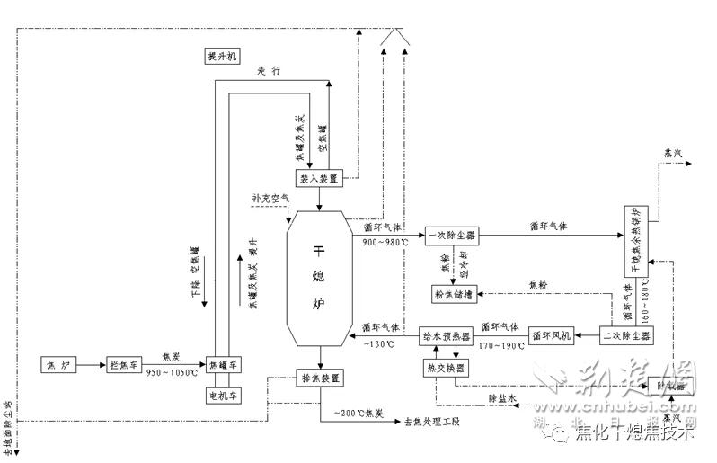 干熄焦,相對濕熄焦而言,是指采用惰性氣體將紅焦降溫冷卻的一種熄焦方法。在干熄焦過程中,紅焦從干熄爐頂部裝入,低溫惰性氣體由循環(huán)風(fēng)機(jī)鼓入干熄爐冷卻段紅焦層內(nèi),吸收紅焦顯熱,冷卻后的焦炭從干熄爐底部排出,從干熄爐環(huán)形煙道出來的高溫惰性氣體流經(jīng)干熄焦鍋爐進(jìn)行熱交換,鍋爐產(chǎn)生蒸汽,冷卻后的惰性氣體由循環(huán)風(fēng)機(jī)重新鼓入干熄爐,惰性氣體在封閉的系統(tǒng)內(nèi)循環(huán)使用。該技術(shù)可節(jié)約用水、減少大氣污染物排放,回收大量紅焦顯熱并產(chǎn)生中高壓蒸汽,有效提高能源利用效率及焦炭質(zhì)量,擴(kuò)大煉焦煤適應(yīng)性,降低煉鐵工序能耗,最終實現(xiàn)企業(yè)的節(jié)能減排。