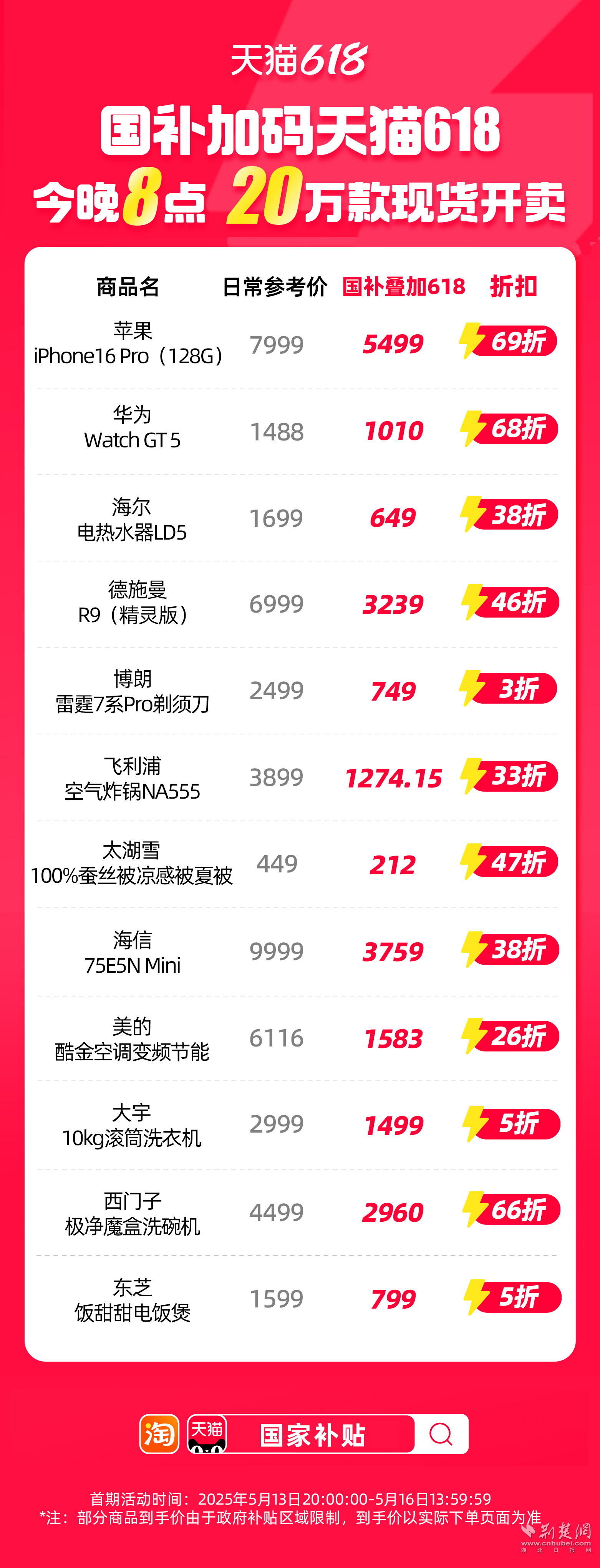 蘋果直降2000元,iPhone16 Pro首次進入國補,到手價5499元。大宇10公斤滾筒洗衣機,國補疊加618優(yōu)惠,打5折,到手價1499元;美的節(jié)能空調,打35折,到手價1583元;75寸Mini LED海信電視,打38折,補貼后到手價3759元;西門子極凈魔盒洗碗機,打66折,到手價2960元;東芝飯?zhí)鹛痣婏堨遥?折,到手價799元。