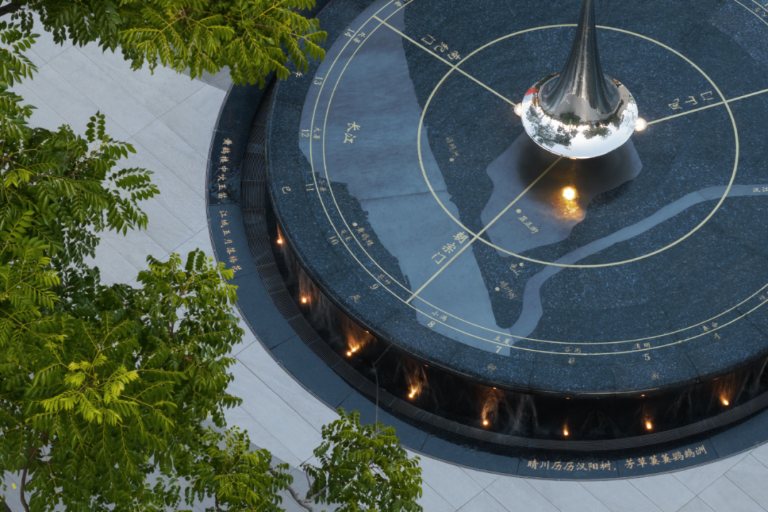 △「武漢之眼」入口廣場(chǎng)中心,擺放有精致的日晷藝術(shù)裝置。走進(jìn)入口廣場(chǎng)中心,其精致的日晷藝術(shù)裝置與水景巧妙結(jié)合成為視覺焦點(diǎn),可以從這些藝術(shù)裝置窺見漢陽(yáng)的文化歷史。尤其是夜晚,水景被柔和的燈光照亮,如同夜空中最亮的星,為廣場(chǎng)增添了幾分夢(mèng)幻與浪漫。