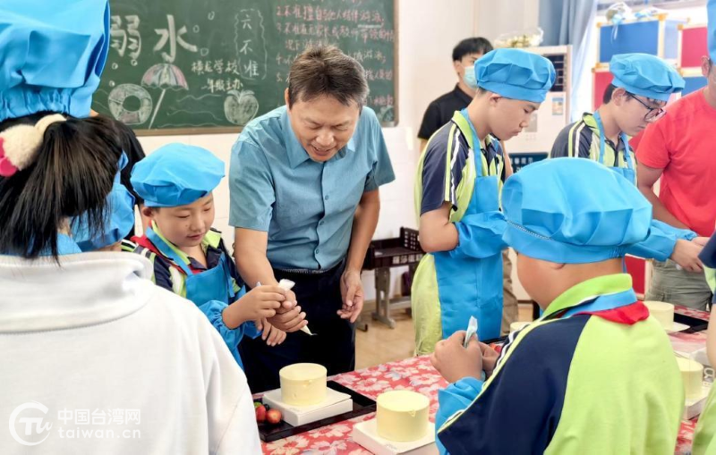 武漢臺資企業(yè)協(xié)會常務(wù)副會長兼公益委員會主委、武漢羅莎食品有限公司總經(jīng)理鄭聰評與孩子們共同體驗蛋糕裱花。(中國臺灣網(wǎng)發(fā))