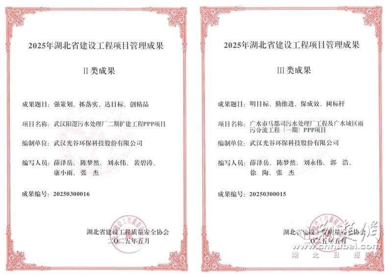 光谷環(huán)保項(xiàng)目管理成果證書。通訊員供圖