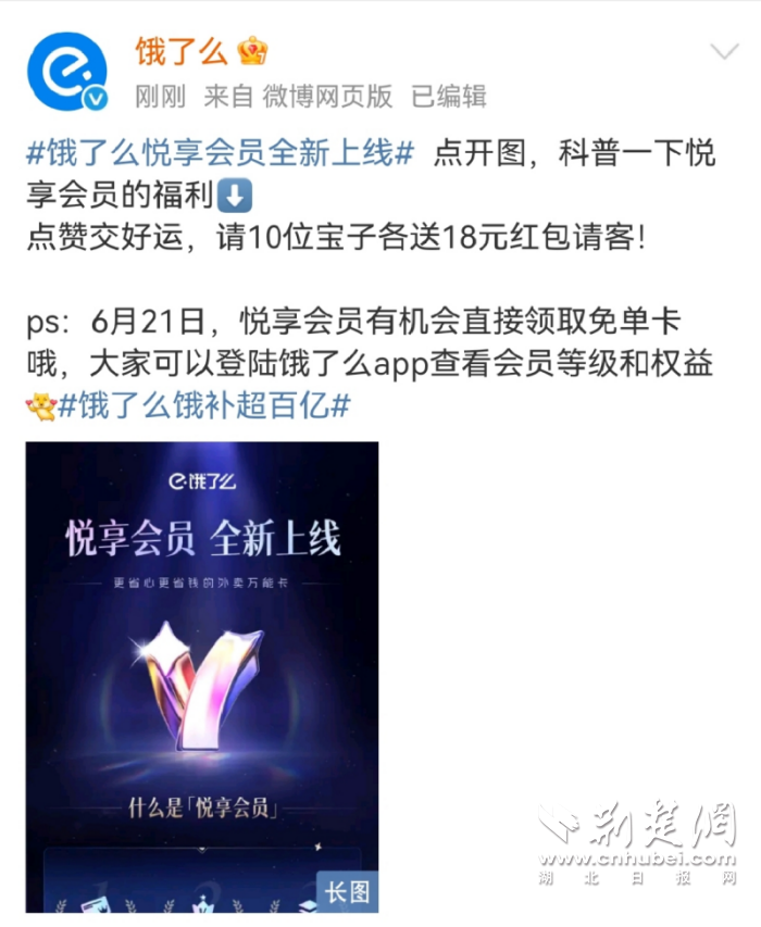 荊楚網(wǎng)(湖北日報網(wǎng))訊(通訊員 易曄)在“外賣大戰(zhàn)”持續(xù)升溫的背景下,餓了么近日繼續(xù)發(fā)力用戶側(cè)體驗升級。6月18日,餓了么官宣已在全國上線“悅享會員”,推出多項貼心服務(wù)和專屬權(quán)益,主打讓用戶“用得多省得多”。