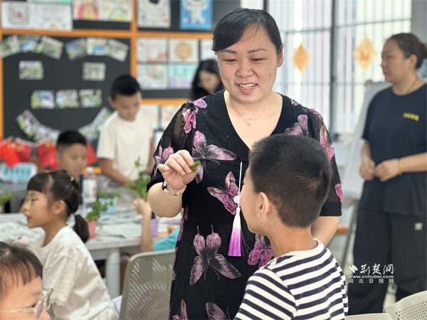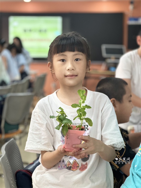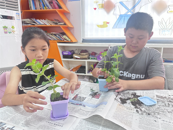 種植環(huán)節(jié)中,周帆帶著薄荷苗、花盆和泥炭土,手把手指導(dǎo)填土、定植、澆水。孩子們邊操作邊交流,指尖沾著泥土也興致勃勃。武漢市青山區(qū)鋼城第十九小學(xué)學(xué)生彭思瑞笑言:“我是托管班‘老學(xué)員’,連續(xù)三年參加暑期托管班,在這里上課比打游戲更有成就感,泥土的味道讓我很放松?!?/p>