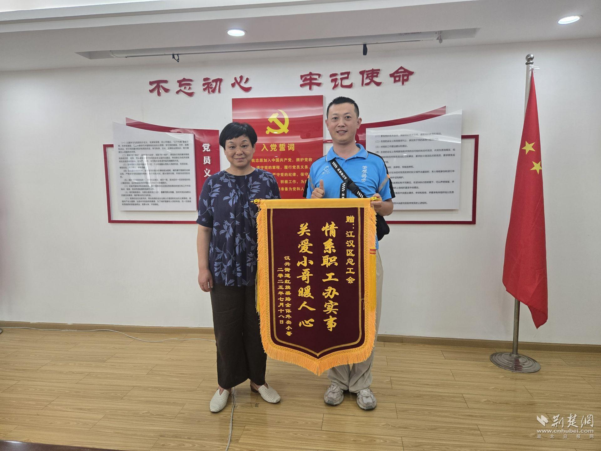 荊楚網(湖北日報網)訊(記者 何婧 通訊員 羅驗)“關愛小哥暖人心,情系職工辦實事”,7月17日上午,江漢區(qū)總工會收到了一面來自漢興街道餓了么紅旗渠路驛站的錦旗。