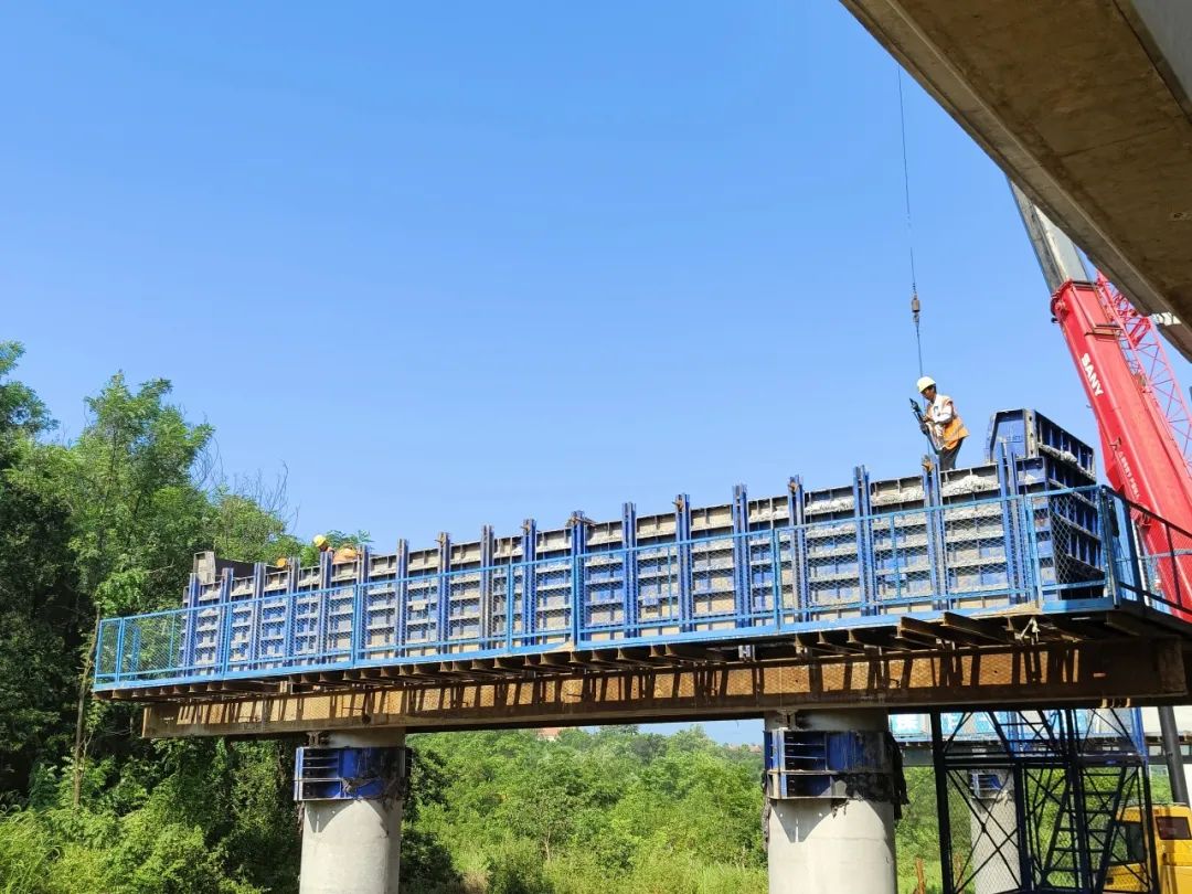 位于王家河街的鳳凰山大橋全長840米,自5月20日啟動架梁施工以來,建設(shè)團(tuán)隊(duì)面對高溫、雨季等多重挑戰(zhàn),通過優(yōu)化施工方案、增加夜間作業(yè)班次,將工期壓縮了10天,提前完成140片箱梁架設(shè)任務(wù)。當(dāng)天,記者在施工現(xiàn)場看到,大橋左幅預(yù)制箱梁已全部架設(shè)完成,實(shí)現(xiàn)左幅貫通。