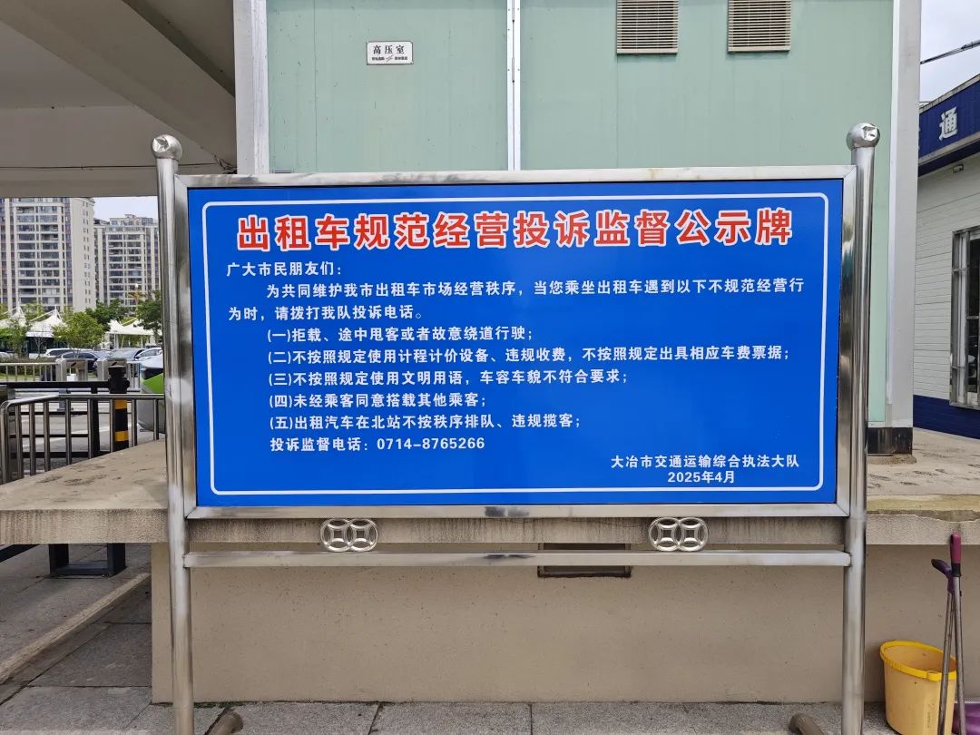 值得注意的是,今年7月,市交通運(yùn)輸綜合執(zhí)法大隊(duì)在大冶北站出站口設(shè)置了出租車投訴點(diǎn),旁有“出租車規(guī)范經(jīng)營投訴監(jiān)督公示牌”,明確拒載、不按規(guī)定使用計(jì)價設(shè)備等行為可在此投訴。