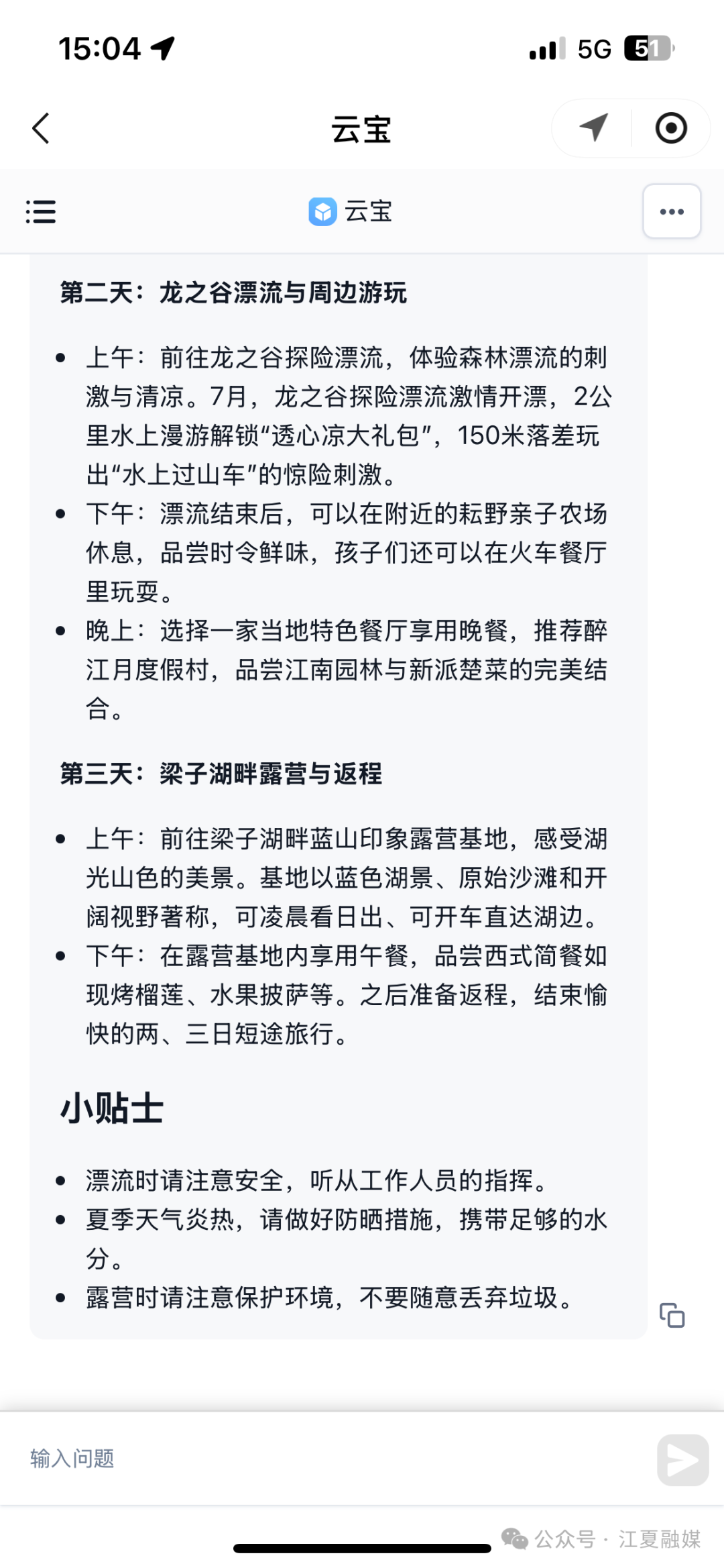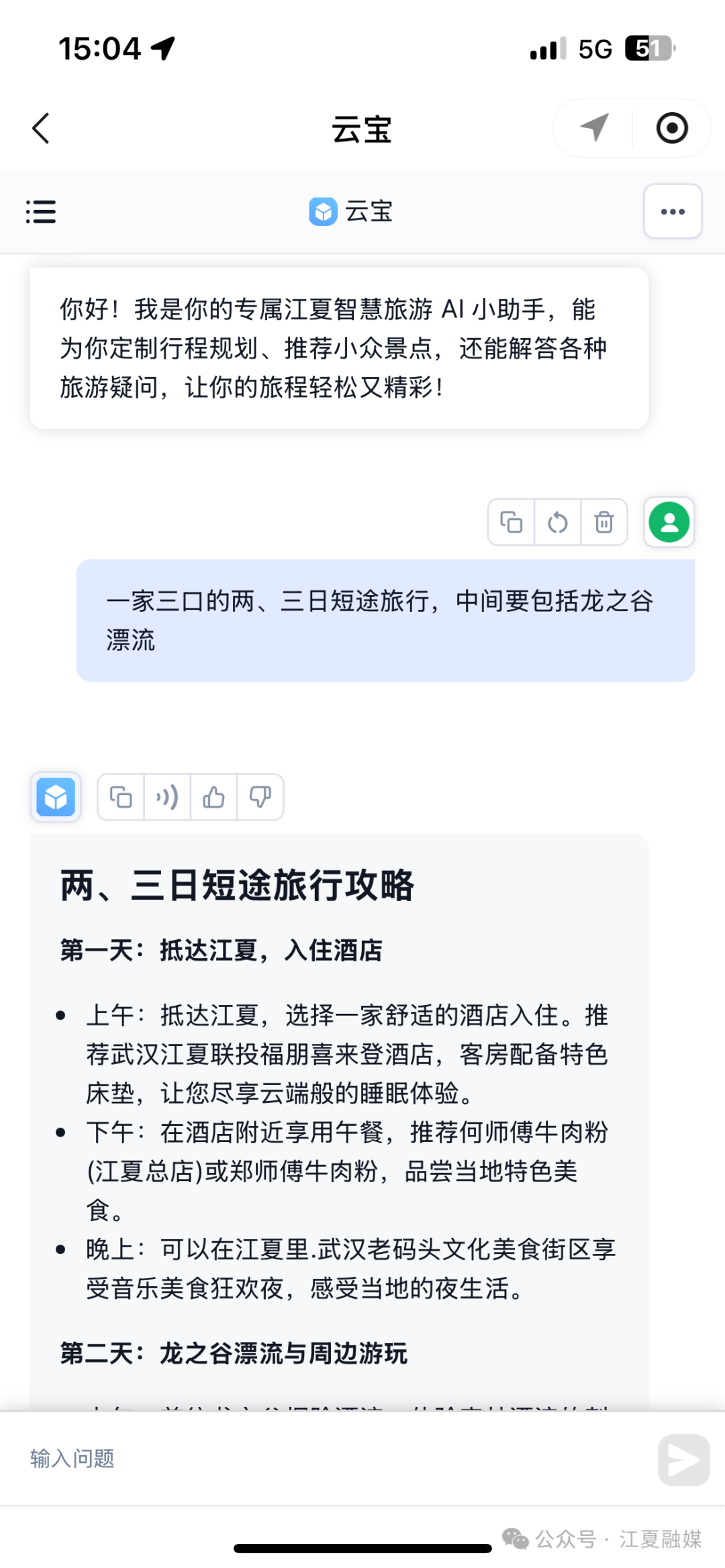 荊楚網(wǎng)(湖北日?qǐng)?bào)網(wǎng))訊 (通訊員 王夫之)暑假臨近結(jié)束,不少家庭都在計(jì)劃一場(chǎng)既能避暑又適合親子互動(dòng)的旅行,但面對(duì)眾多目的地和繁雜的信息,想要規(guī)劃出一條貼合自家需求的完美路線,是不是常常讓人犯難,別擔(dān)心,AI云寶來(lái)幫忙!