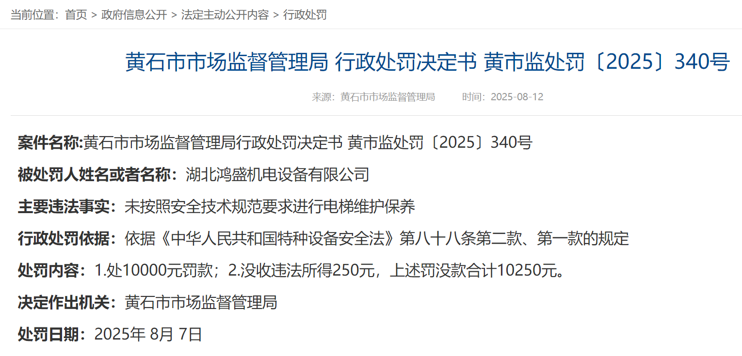 公告顯示,三家受處罰企業(yè)分別為湖北鴻盛機電設備有限公司、黃石市中信電梯工程有限公司和深圳市開元科創(chuàng)樓宇科技有限公司。主要違法事實均為“未按照安全技術規(guī)范要求進行電梯維護保養(yǎng)”。依據(jù)《中華人民共和國特種設備安全法》第八十八條第二款、第一款的規(guī)定,黃石市市場監(jiān)督管理局在統(tǒng)一作出處10000元罰款的同時,還分別對三家違法企業(yè)分別處以沒收違法所得250元、258.33元、282.27元。