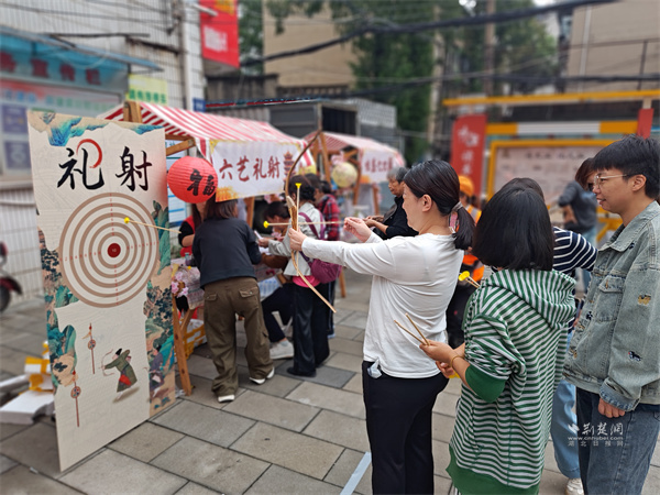 游戲互動(dòng)區(qū)氛圍熱烈?!吧涓膊轮i”攤位前,居民踴躍參與,猜中謎底者可獲贈(zèng)汪玉霞蘇月餅;“投壺納?!蔽娙艘辉嚿硎?,在趣味中感受古禮韻味;“福來(lái)套圈”則準(zhǔn)備了洗衣液、透明皂等實(shí)用獎(jiǎng)品,深受居民喜愛(ài)。此外,“六藝禮射”項(xiàng)目讓居民親身體驗(yàn)傳統(tǒng)射藝,在拉弓搭箭間感受古人的尚武精神與禮儀風(fēng)范。
