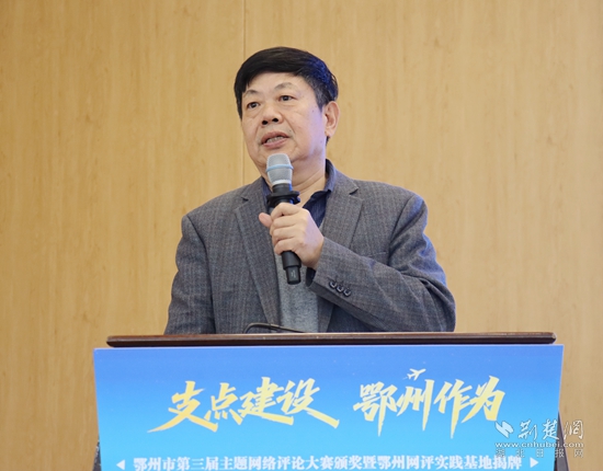 頒獎活動現(xiàn)場,湖北省社會科學院原副院長、省政府咨詢委員、長江經(jīng)濟帶智庫聯(lián)盟秘書長秦尊文受邀出席,并從網(wǎng)評的角度,圍繞“弘揚花湖精神 助力支點建設”主題,發(fā)表了主旨演講。他結合最新公布的《中共中央關于制定國民經(jīng)濟和社會發(fā)展第十五個五年規(guī)劃的建議》,高屋建瓴分析了鄂州當前的經(jīng)濟形勢,提出了切實可行的建議。湖北省委直屬機關工委干部馮歡以中央網(wǎng)信辦網(wǎng)絡評論“創(chuàng)四優(yōu)”競賽獲獎作者身份,分享了自己多年網(wǎng)評文章寫作的心得體會,風趣幽默、干貨滿滿。