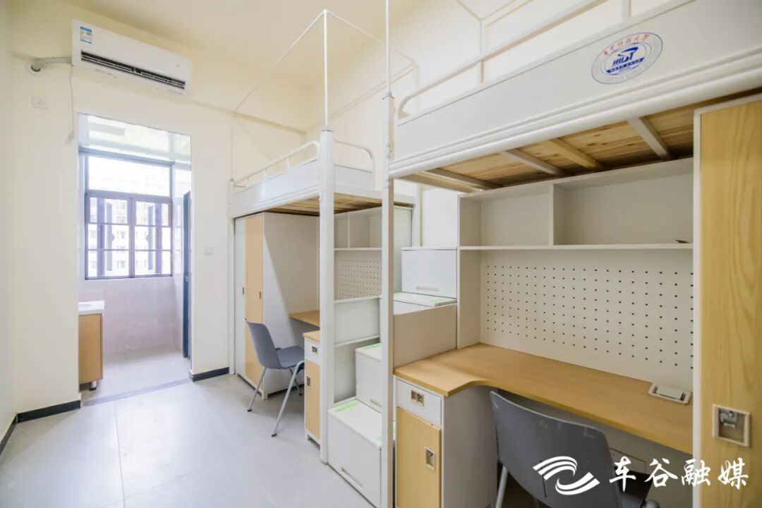 軍山校區(qū)建有7棟學(xué)生宿舍樓。北區(qū)的2棟主要面向本科生,以四人間為主。南區(qū)的5棟主要面向研究生,碩士生宿舍為兩人間,博士生宿舍為八人套房。宿舍樓一層為公共空間與服務(wù)樞紐,設(shè)有接待前臺(tái),提供寄存、維修、反饋等服務(wù),設(shè)有多功能學(xué)習(xí)與活動(dòng)空間、自習(xí)室、研討室、黨團(tuán)活動(dòng)室、咨詢室,滿足多種需求。二層及以上是住宿區(qū),電梯直達(dá)、功能完善,公共服務(wù)區(qū)配備洗衣機(jī)、烘干機(jī)、洗鞋機(jī)、直飲機(jī)。宿舍采用智能門(mén)鎖,上床下桌,獨(dú)立衛(wèi)浴,多功能學(xué)習(xí)桌搭配人體工學(xué)座椅,為學(xué)生提供舒適的學(xué)習(xí)住宿環(huán)境。