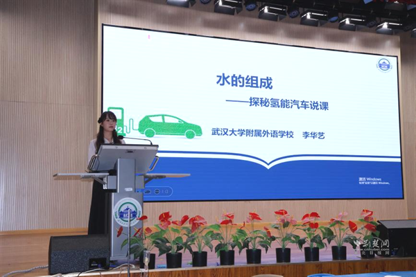 武漢大學(xué)附屬外語學(xué)校李華藝?yán)蠋焾?zhí)教《水的組成——探秘氫能汽車》展示課。課程以新能源汽車為線索,設(shè)計四大項目,學(xué)生通過海報、角色扮演等形式展示探究成果。李老師引導(dǎo)學(xué)生從宏觀、微觀、符號三重視角認(rèn)識水的組成,最終用電解產(chǎn)生的氫能讓小車現(xiàn)場行駛,實現(xiàn)化學(xué)與科技的有機融合。說課環(huán)節(jié)中,她介紹項目圍繞“氫能汽車如何工作”展開,借助AI模擬生產(chǎn)過程,讓學(xué)生感受化學(xué)的實踐價值。