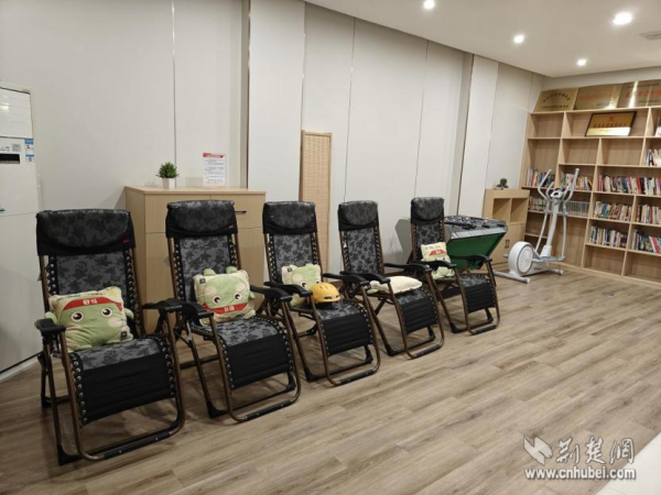 走進這個330平方米的升級版驛站,變化隨處可見。這里不僅有基礎的微波爐、冰箱、沙發(fā)等,更添置了共享淋浴間、聽書機、直飲機、空調等。曾經(jīng)的后廳,如今被打造成一個多功能“潮玩空間”——午休時間,拉上窗簾,這里是配備了舒適躺椅的靜謐午睡室;工作之余,這里又變身為熱鬧的“社交俱樂部”,大家可以一起看電視、玩桌游,徹底放松身心。