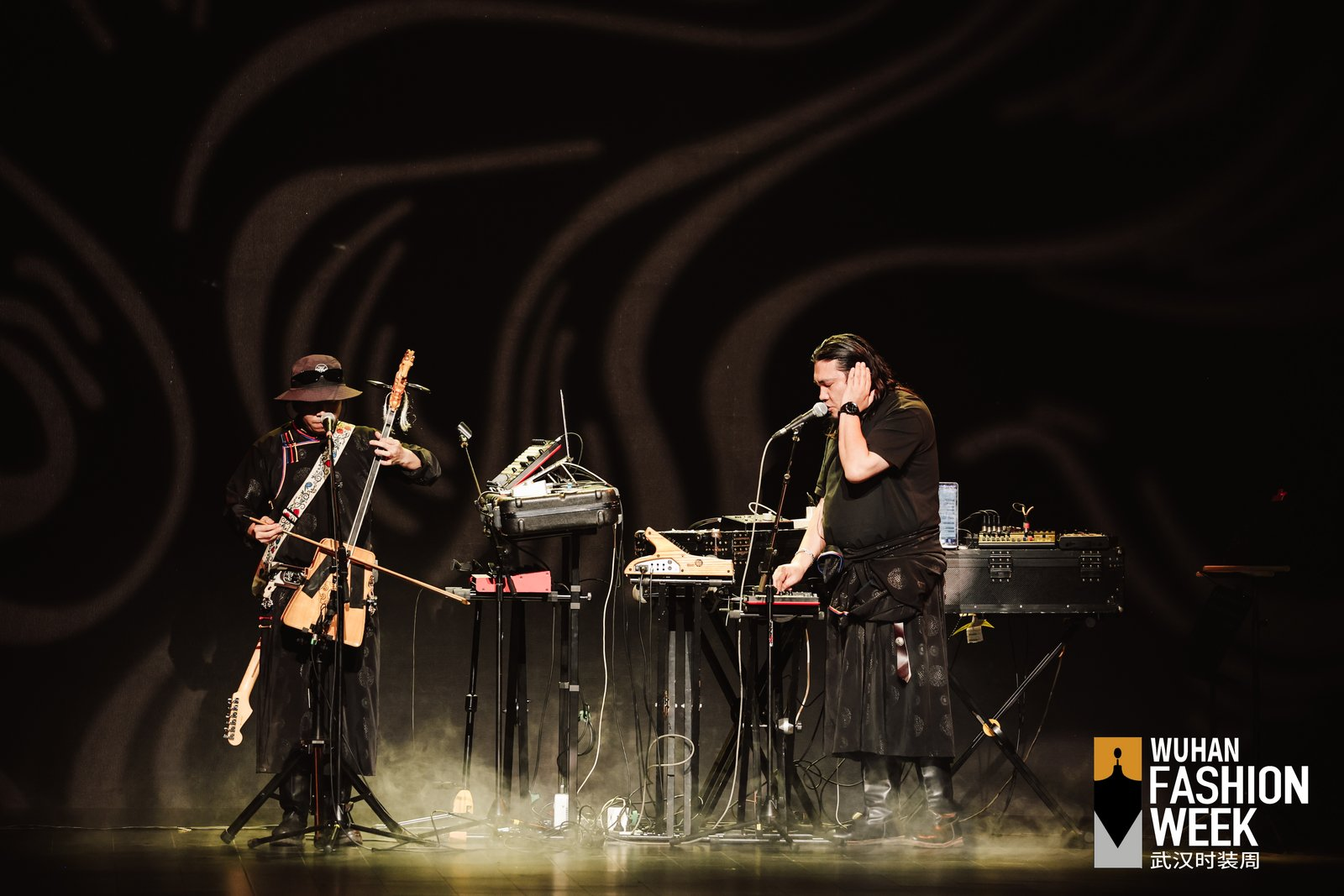 陳宇攜手Taiga樂隊(duì),把錫林郭勒草原的晨霧、馬頭琴與電子節(jié)拍轉(zhuǎn)化成可行走的時裝音景??沙掷m(xù)植物素皮、流蘇與繩結(jié)形成呼應(yīng),讓游牧精神在當(dāng)代廓形中保持自由。