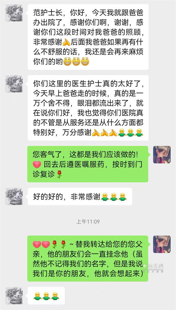 這份細(xì)致關(guān)懷,也深深印在患者和家屬心里?;颊卟痰鲈呵埃畠禾匾饨o副護士長范美玲發(fā)來微信:“你們這里的醫(yī)生護士真是太好了,爸爸在這住得比家里還舒心,你們比親人還細(xì)心。今天早上離開的時候,他一萬個舍不得,反復(fù)念叨著不想走?!?/p>