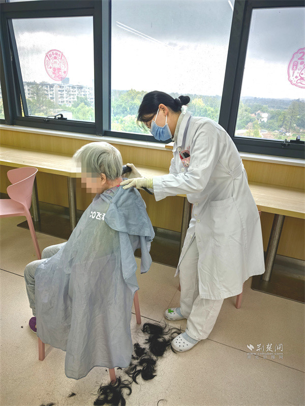 李奶奶剛?cè)朐簳r,抗拒一切護理,洗頭理發(fā)還鬧脾氣,家屬帶她跑了三家理發(fā)店,都沒剪成。當(dāng)班護士看著家屬焦急的樣子,主動接下了這件事。