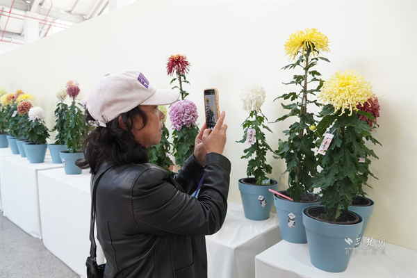 硚口區(qū)古田街道古二社區(qū)園藝師陳福英用手機記錄菊花品種。通訊員供圖