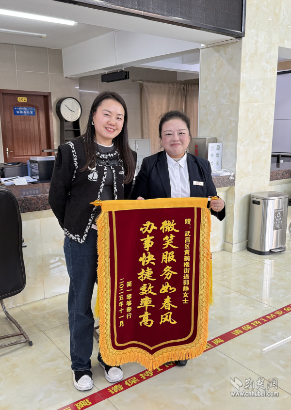 荊楚網(wǎng)(湖北日報(bào)網(wǎng))訊(通訊員劉麗)近日,武昌區(qū)黃鶴樓街道便民服務(wù)中心工商窗口上演了暖心一幕。一位商戶代表將一面書寫著“微笑服務(wù)如春風(fēng),辦事快捷效率高”的錦旗,鄭重送到工作人員郭靜手中,對她即使在生病住院期間仍堅(jiān)持線上為商戶排憂解難的敬業(yè)精神表達(dá)誠摯謝意。