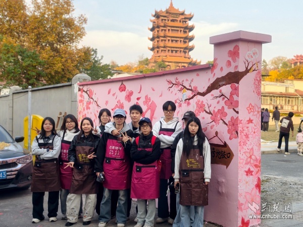 活動首日,志愿者們早早來到現(xiàn)場,分工協(xié)作完成物料搬運、防護鋪設(shè)等準備工作。隨著畫筆起落,原本單調(diào)的灰墻被溫柔的粉色調(diào)漸漸覆蓋,“武漢”兩個大字輪廓清晰浮現(xiàn),兩側(cè)櫻花枝椏初現(xiàn)雛形。在冬日的暖陽下,志愿者們俯身勾勒、抬手描繪,讓冰冷墻面開始煥發(fā)浪漫生機。