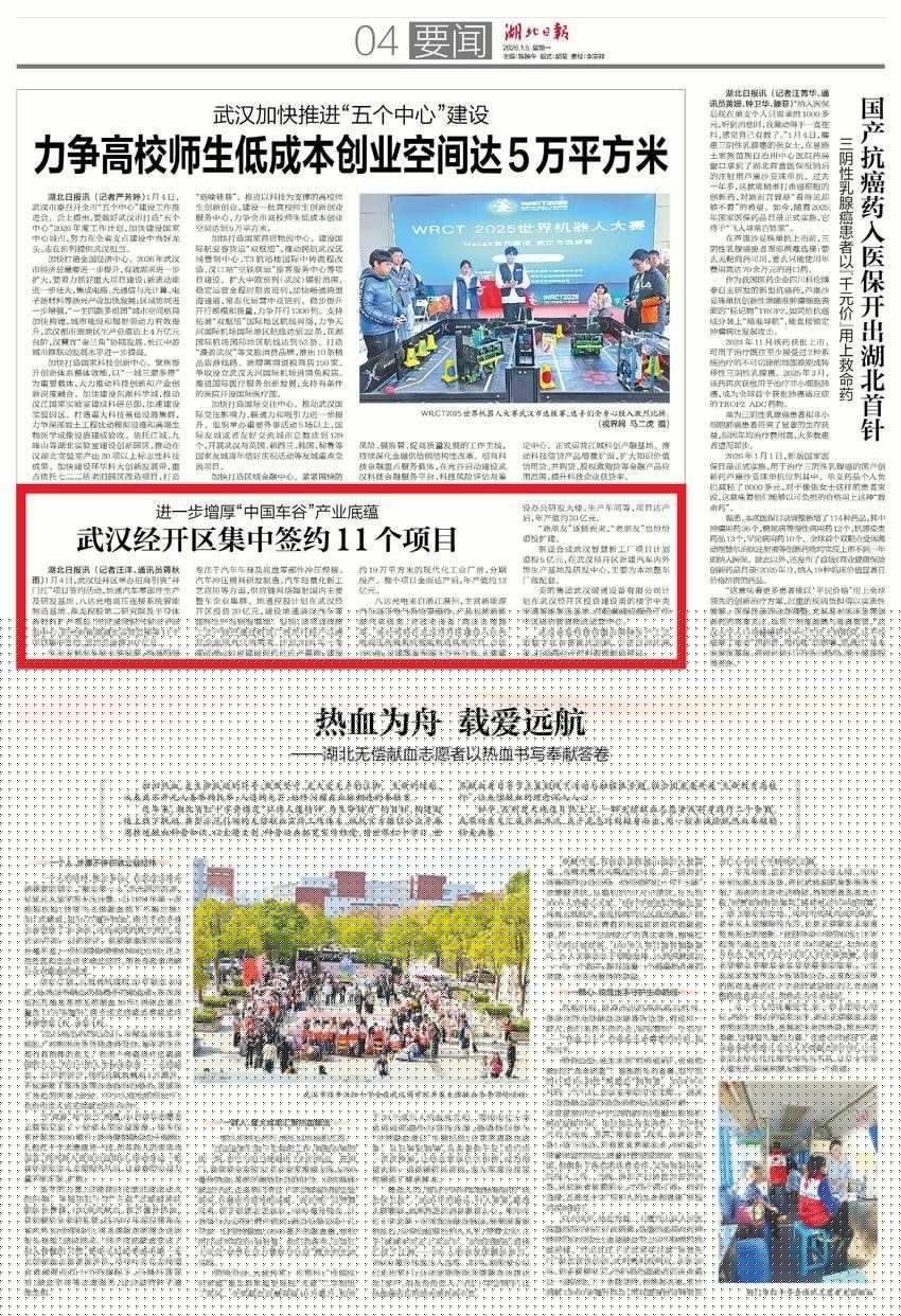 1月5日,湖北日報要聞版報道:進一步增厚“中國車谷”產(chǎn)業(yè)底蘊 武漢經(jīng)開區(qū)集中簽約11個項目