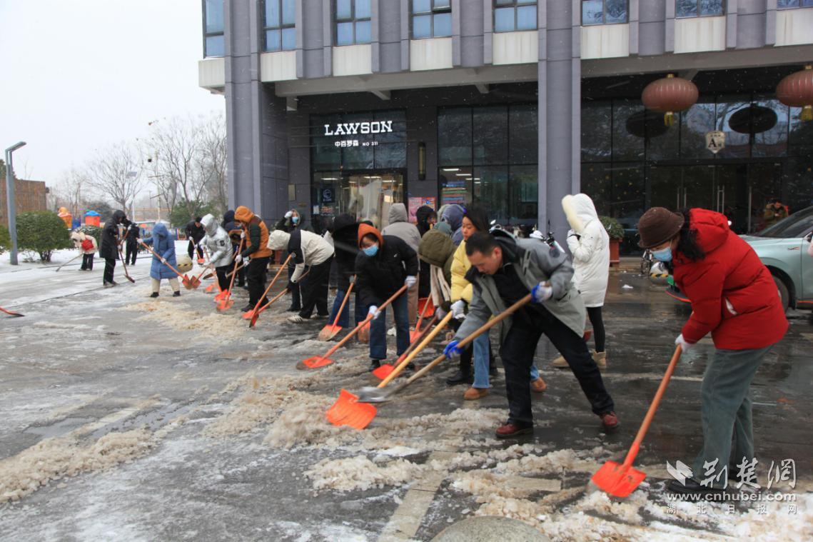 在洪山獅子山社區(qū)、東湖高新區(qū)豹澥街道、漢陽區(qū)江堤及四新街道、東湖風景區(qū)各村場,物業(yè)、居民志愿者在市民在確保安全的前提下,就近參與掃雪鏟冰、鋪設草墊,對居民小區(qū)出入口、單元門棟、地下車庫坡道等關鍵區(qū)域積雪積冰進行清理,對轄區(qū)幼兒園、小學、初中等學校周邊路段開展融雪除冰,確保居民出行暢通,共同維護美麗武漢。