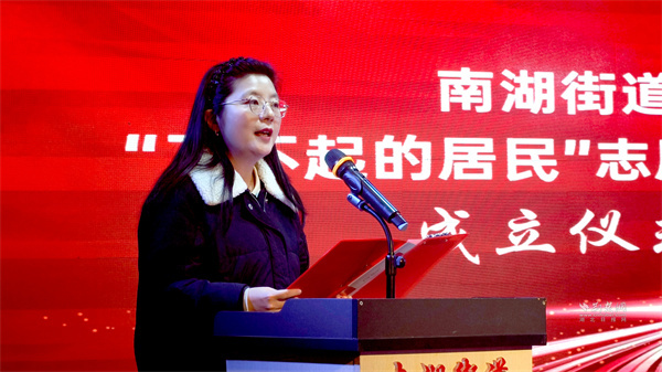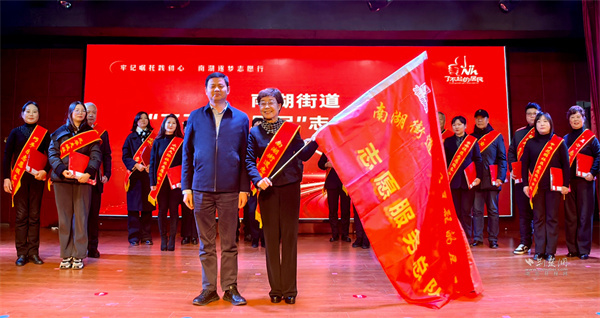 活動的另一重頭戲,是“了不起的居民”志愿服務(wù)總隊的成立儀式。在區(qū)委社會工作部部長謝琬宣讀成立文件后,區(qū)委副書記、統(tǒng)戰(zhàn)部部長劉海停上臺為總隊隊長張淑靜授旗,標志著南湖街道近300支活躍的志愿服務(wù)隊伍,有了統(tǒng)一的旗幟與核心。