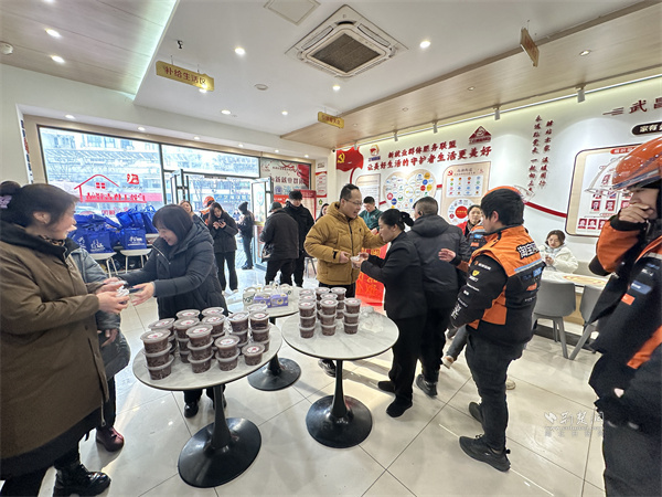 活動(dòng)現(xiàn)場,“暖心聯(lián)盟”企業(yè)劉胖子家常菜館中央花園店開展“暖心臘八粥 暖胃更暖心”服務(wù),提供百余份臘八粥。工作人員將臘八粥分裝至便攜餐盒,搭配一次性餐具,供戶外工作者排隊(duì)領(lǐng)取,方便其攜帶食用。外賣小哥夏博文表示,驛站每逢節(jié)日都會(huì)組織關(guān)懷活動(dòng),剛開完晨會(huì)就能吃上熱粥,切實(shí)感受到“娘家人”的關(guān)懷,渾身充滿干勁。