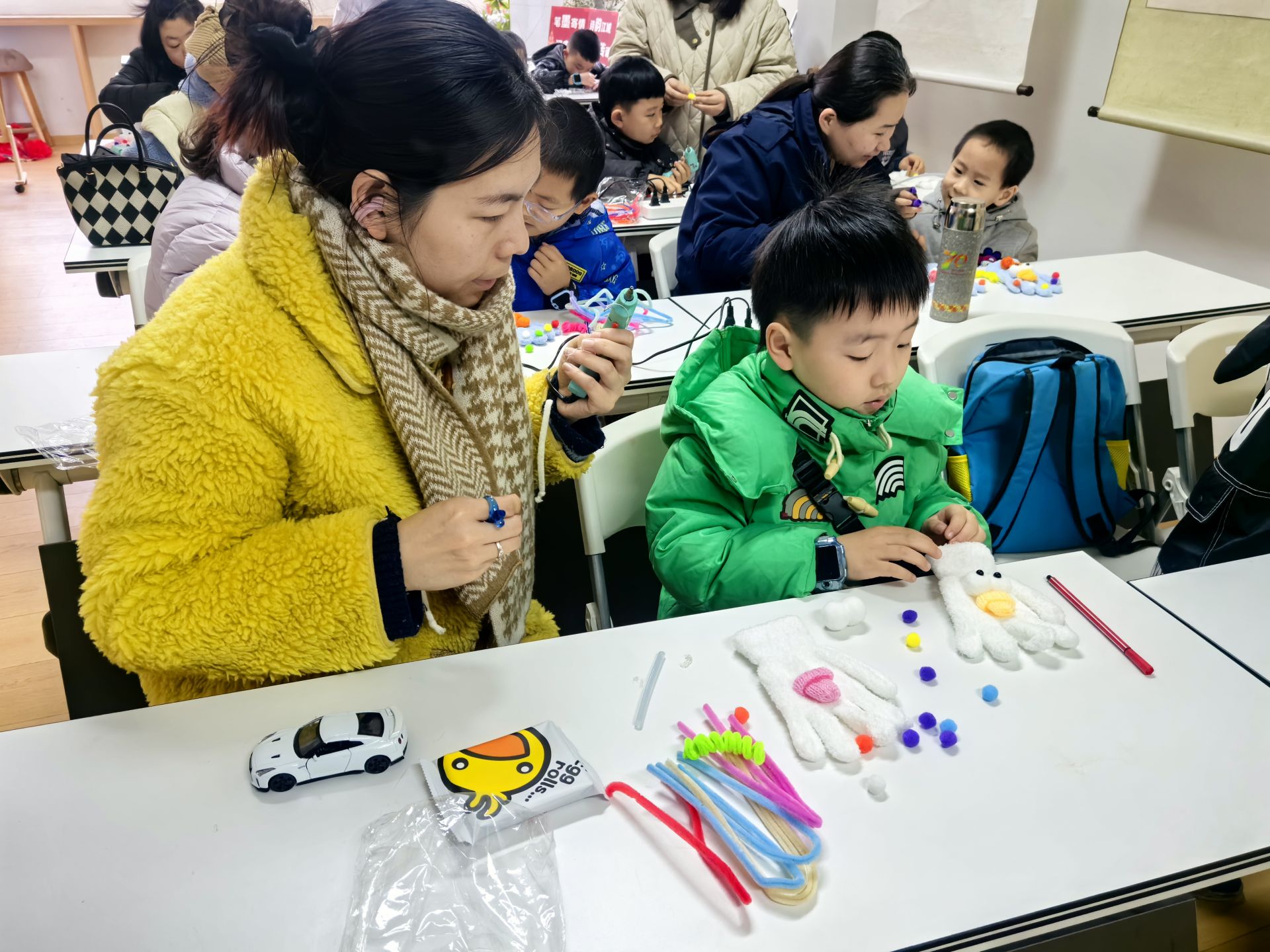 活動圍繞傳統(tǒng)布藝展開,既保留了手工的韻味,又增添了童趣與實用性。書房為每個家庭準備了精心搭配的材料包,柔軟的毛絨面料、五彩斑斕的小毛球、可隨意造型的彩色扭扭棒,還有一雙雙靈動可愛的“小眼睛”貼片,讓零基礎(chǔ)的家庭也能輕松上手。