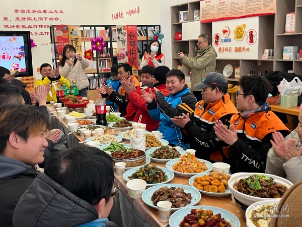 溫馨的團圓飯環(huán)節(jié),街道工會特意準備了地道的家鄉(xiāng)菜與象征團圓的小年餃子。熱騰騰的飯菜上桌,驛站里頓時煙火氣十足。大家圍坐在一起,品嘗可口菜肴,分享跑單路上的趣事與家鄉(xiāng)的年俗。一聲聲祝福、一句句家常,在舉杯與歡笑中交織出其樂融融的團圓畫面。