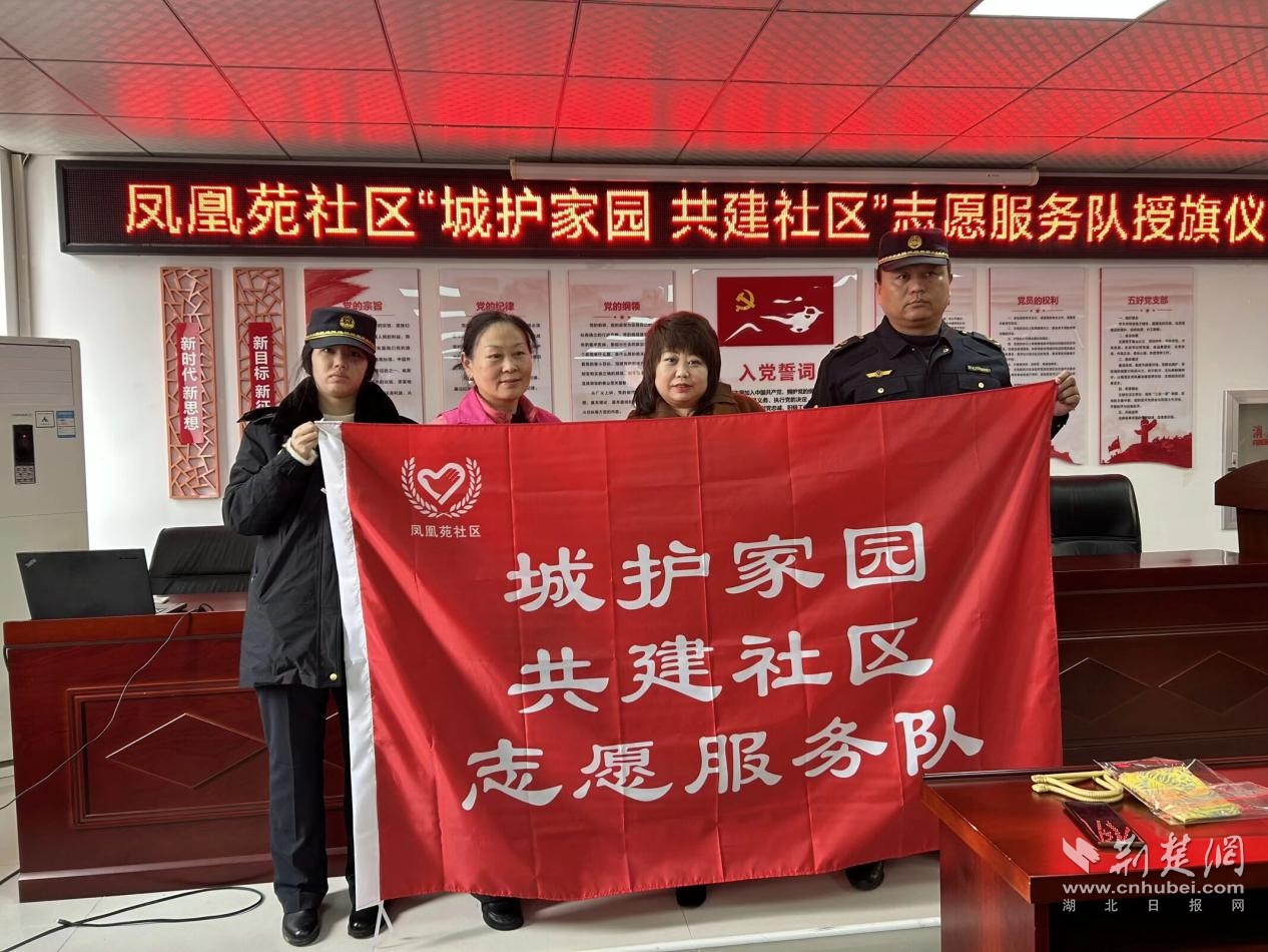 現(xiàn)場為“城護(hù)家園 共建社區(qū)”志愿服務(wù)隊授旗。通訊員供圖