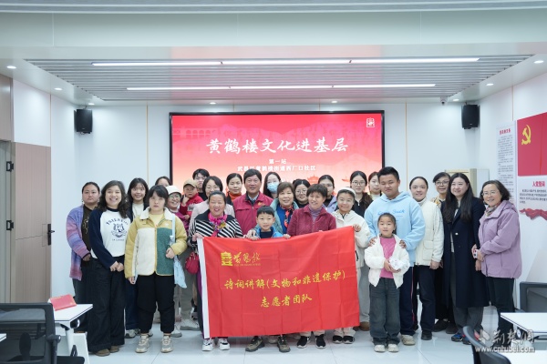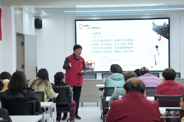 活動中,來自黃鶴樓公園的詩詞志愿者用生動通俗的語言將深奧的古典詩詞與城市文化娓娓道來。從崔顥的千古絕唱,到李白“煙花三月下?lián)P州”的灑脫飄逸;從歷代文人墨客登樓賦詩的文壇佳話,到黃鶴樓屢毀屢建所見證的城市變遷,志愿者將詩詞典故與武漢的城市發(fā)展、人文精神巧妙串聯(lián)。居民們凝神聆聽,時而點(diǎn)頭會意,時而低聲交流,仿佛穿越千年,與古人隔空對話。