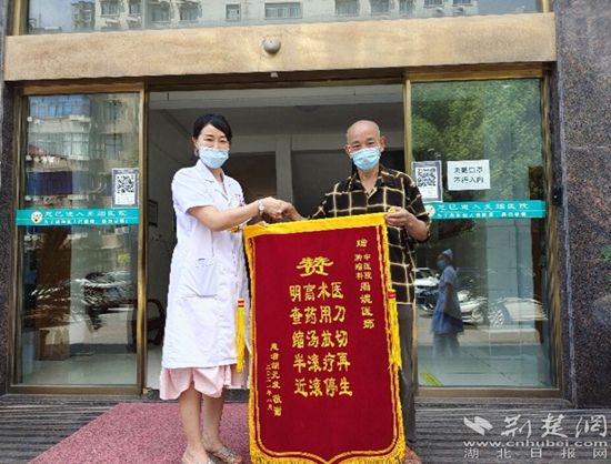 荊楚網(wǎng)(湖北日報網(wǎng))訊(通訊員 陳艷華)8月30日上午,腫瘤患者胡爹爹帶著一面寫著“醫(yī)刀切再生,術(shù)用放療停,高藥湯滾滾,明查縮半近”的錦旗送至鄂州市中醫(yī)醫(yī)院腫瘤科周娓主任手上,以表達(dá)他對周娓主任和腫瘤科全體醫(yī)務(wù)人員高尚醫(yī)德、精湛醫(yī)術(shù)的無限感激和贊揚(yáng)之情。