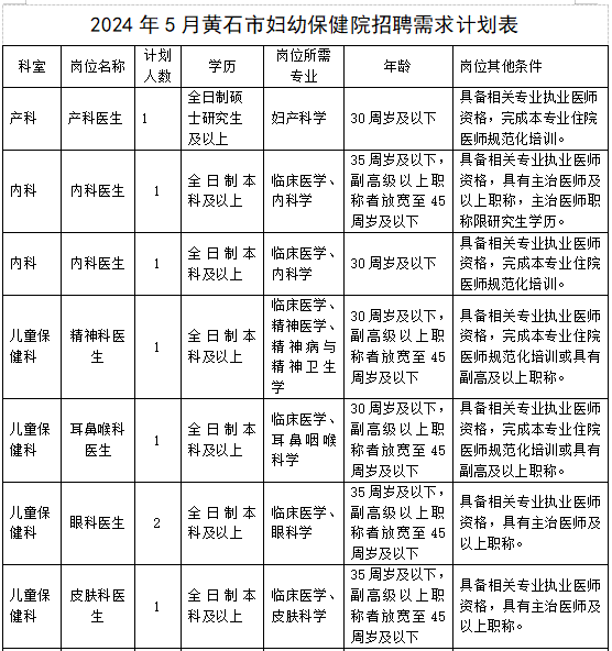 公告稱,即日起至5月21日上午09:00(周六日除外),應(yīng)聘者可攜帶資料到黃石市婦幼保健院人事科教科進行現(xiàn)場資格審查。