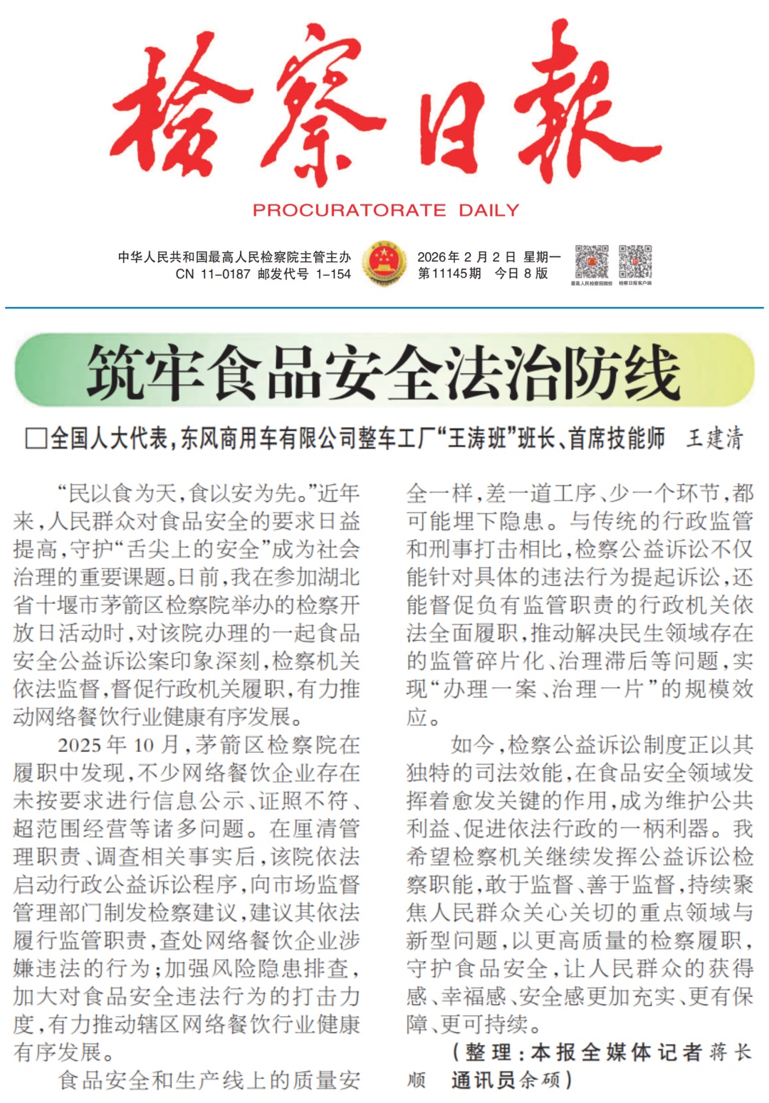 “民以食為天,食以安為先。”近年來,人民群眾對食品安全的要求日益提高,守護(hù)“舌尖上的安全”成為社會治理的重要課題。日前,我在參加湖北省十堰市茅箭區(qū)檢察院舉辦的檢察開放日活動時,對該院辦理的一起食品安全公益訴訟案印象深刻,檢察機關(guān)依法監(jiān)督,督促行政機關(guān)履職,有力推動網(wǎng)絡(luò)餐飲行業(yè)健康有序發(fā)展。