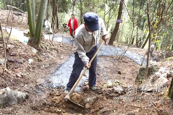 在山上的一片陡坡上,記者看到,二十多名村民正在熱火朝天地鋪路,山上不時還有來來往往爬山的村民,原來,今天是該村周家灣達觀山生態(tài)休閑公園試開放的第一天。