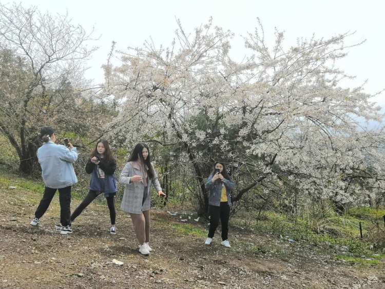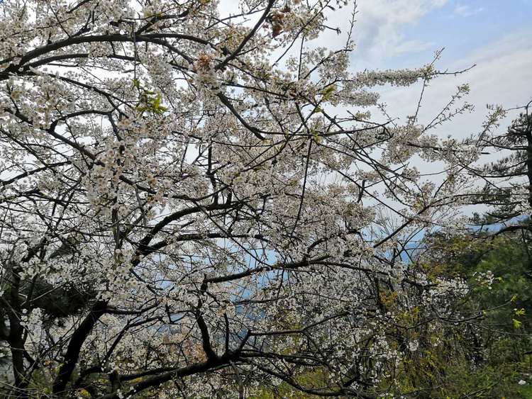 登上山頂,漫山遍野的櫻花開放在樹叢中,大幕的櫻花長(zhǎng)得特別的素雅,游客看了心中便升起一股憐愛(ài)之情。