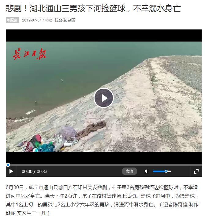 6月30日,咸寧市通山縣慈口鄉(xiāng)石印村突發(fā)悲劇,村子里3名男孩到河邊撿籃球時,不幸滑進河中溺水身亡。當天下午2點許,孩子在該村籃球場上活動?;@球飛進河中,為撿籃球,其中1名上初一的男孩與2名上小學六年級的男孩,滑進河中溺水身亡。(記者陳奇雄 制作 熊麗 實習生王一凡)