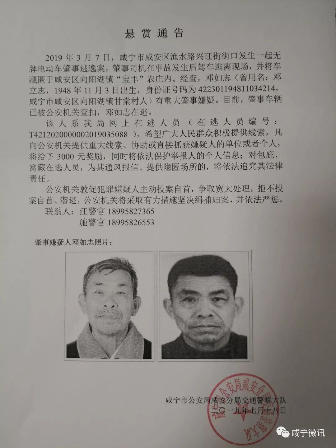 2019年3月7日,咸寧市咸安區(qū)漁水路興旺街街口發(fā)生一起無牌電動車肇事逃逸案,肇事司機(jī)在事故發(fā)生后駕車逃離現(xiàn)場,并將車藏匿于咸安區(qū)向陽湖鎮(zhèn)“寶豐”農(nóng)莊內(nèi)。經(jīng)查,鄧如志(曾用名:鄧立志,1948年11月3日出生,身份證號碼為422301194811034214,咸寧市咸安區(qū)向陽湖鎮(zhèn)甘棠村人)有重大肇事嫌疑。目前,肇事車輛已被公安機(jī)關(guān)查扣,鄧如志在逃。