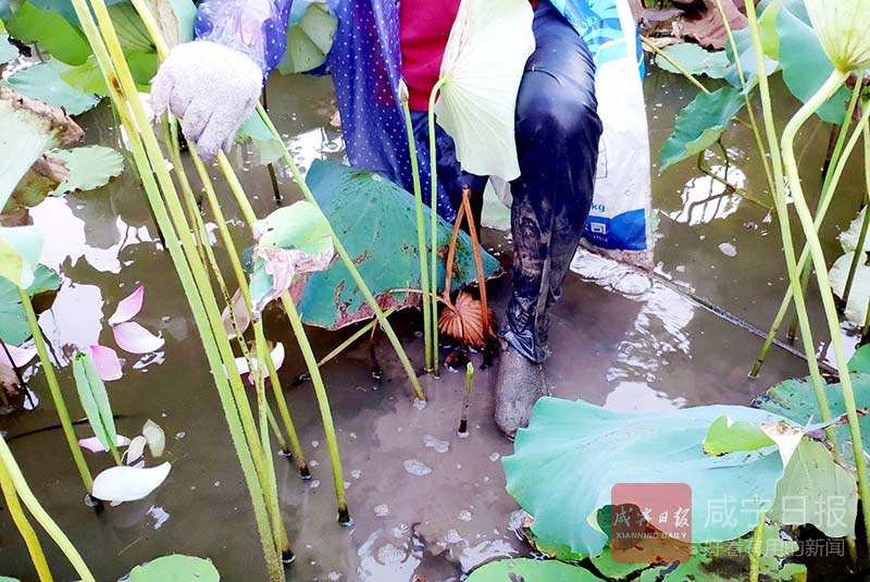荷田里荷葉密集,既悶又熱,有些地方淤泥齊膝。蓮農(nóng)們一般身前身后各掛一個(gè)編織袋,大約 40分鐘采滿上岸。
