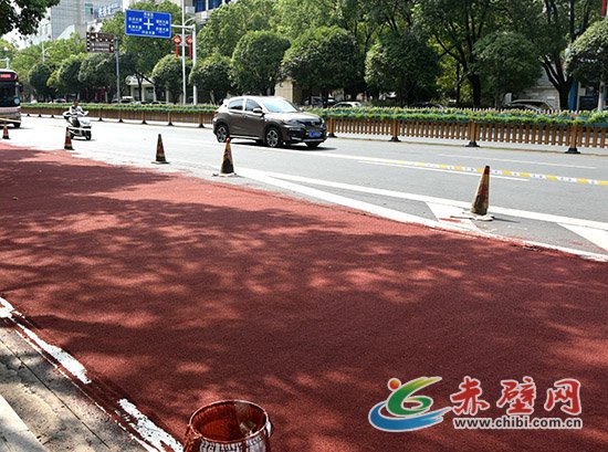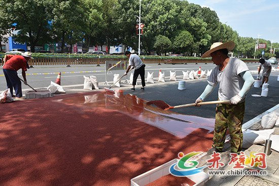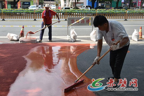 赤壁網(wǎng)消息(記者 聶愛陽)先往地面倒上攪拌均勻的膠粘劑,用推水器推平;再往上撒上陶瓷顆粒,用鐵鏟抹勻。頃刻間,一條嶄新的紅色防滑車道就這樣鋪就而成。8月6日,在赤壁市沿河大道,工人們正在緊張鋪設(shè)紅色防滑車道。
