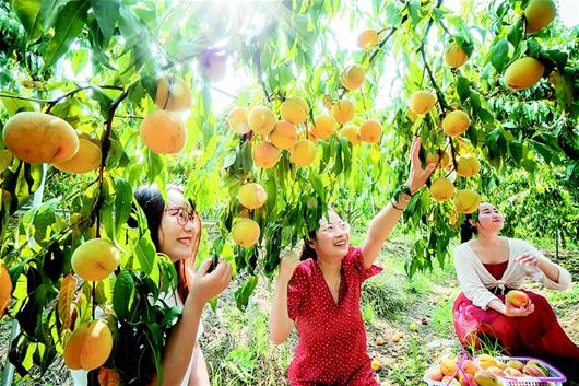 8月7日,嘉魚縣新街鎮(zhèn)嘉多寶果蔬、世外萄園的果園里碩果累累,游客體驗著采摘的快樂。近年來,嘉魚縣新街鎮(zhèn)在351國道沿線建設(shè)“十里花果長廊”,大力發(fā)展農(nóng)旅融合經(jīng)濟。(湖北日報全媒記者陳勇通訊員耿海軍馬映攝)