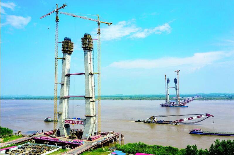 8月21日,赤壁長江大橋正在進行南北主塔中塔柱施工,南北主塔高度達到了133米,占總高度的60%左右。赤壁長江大橋連接赤壁市與洪湖市,主橋是雙塔雙索面斜拉結(jié)構(gòu),主塔為H形。承建單位中鐵大橋局在高溫天氣縮短白天施工時間,早晚補工,保障施工進度不因酷暑延后。預(yù)計明年2月能按期實現(xiàn)主塔封頂?shù)仁┕つ繕?biāo)。(視界網(wǎng) 馬海斌 攝)
