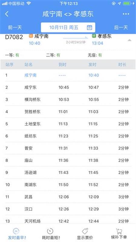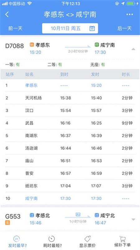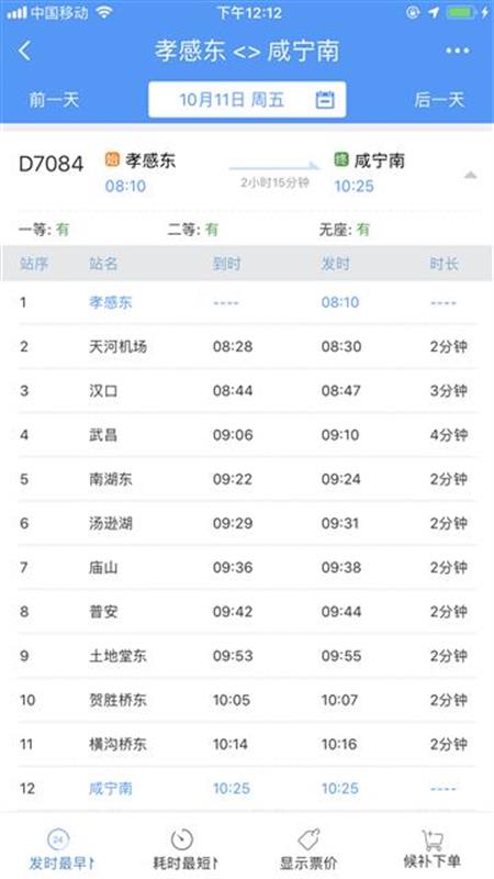 10時(shí)40分從咸寧南始發(fā),沿途??肯虒帠|、橫溝橋東、賀勝橋東、土地堂東、紙坊東、普安、廟山、湯遜湖、南湖東、武昌、漢口、天河機(jī)場(chǎng)等站,13時(shí)04分終到孝感東站;