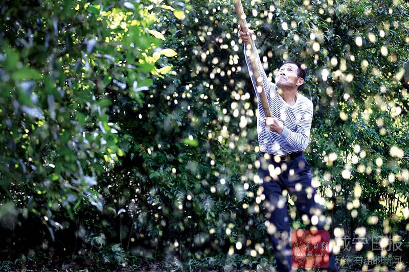 10月19日早上7時(shí)許,咸安區(qū)桂花鎮(zhèn)的村民們,扛起竹篙,帶上棚布,歡快的上山打桂花。
