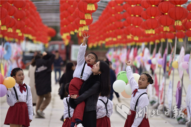 2019年2月2日,小朋友在通城縣塘湖鎮(zhèn)荻田村紅色廣場紅燈籠旁合影。當(dāng)日,湖北省通城縣塘湖鎮(zhèn)荻田村在紅色廣場舉行花傘彩燈民俗節(jié)活動,以趕集逛廟會,舞龍、旗袍秀、跳廣場舞、觀花傘彩燈、草扎、鄉(xiāng)土美味等多彩民間活動展示美麗鄉(xiāng)村建設(shè)成果,在濃濃的年味中喜迎新春。(視界網(wǎng)劉建平攝)