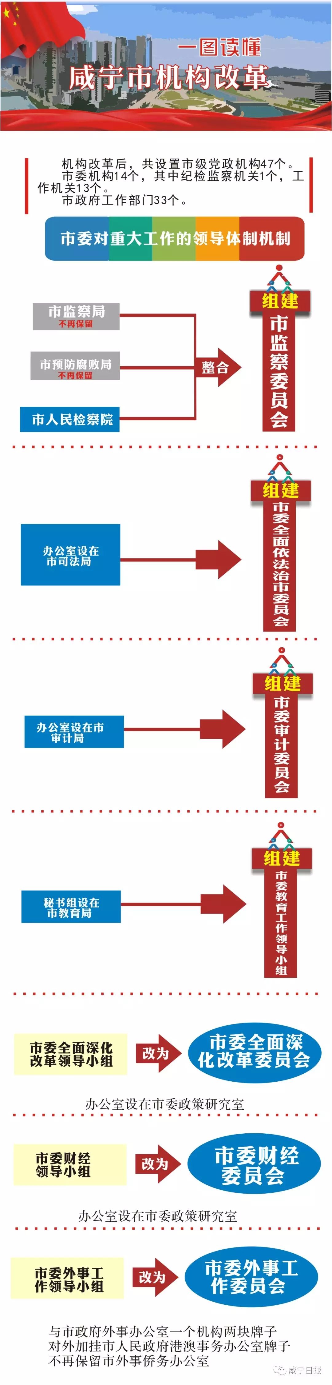 我市召開機構(gòu)改革動員大會,標(biāo)志著我市機構(gòu)改革全面啟動。根據(jù)省委省政府批準(zhǔn)的《咸寧市機構(gòu)改革方案》,本輪機構(gòu)改革后,市本級共設(shè)置黨政機構(gòu)47個。市委機構(gòu)14個,市政府工作部門33個。改革方案還對黨政直屬事業(yè)單位實施了限額管理,并進一步規(guī)范了黨政派出機構(gòu)置。