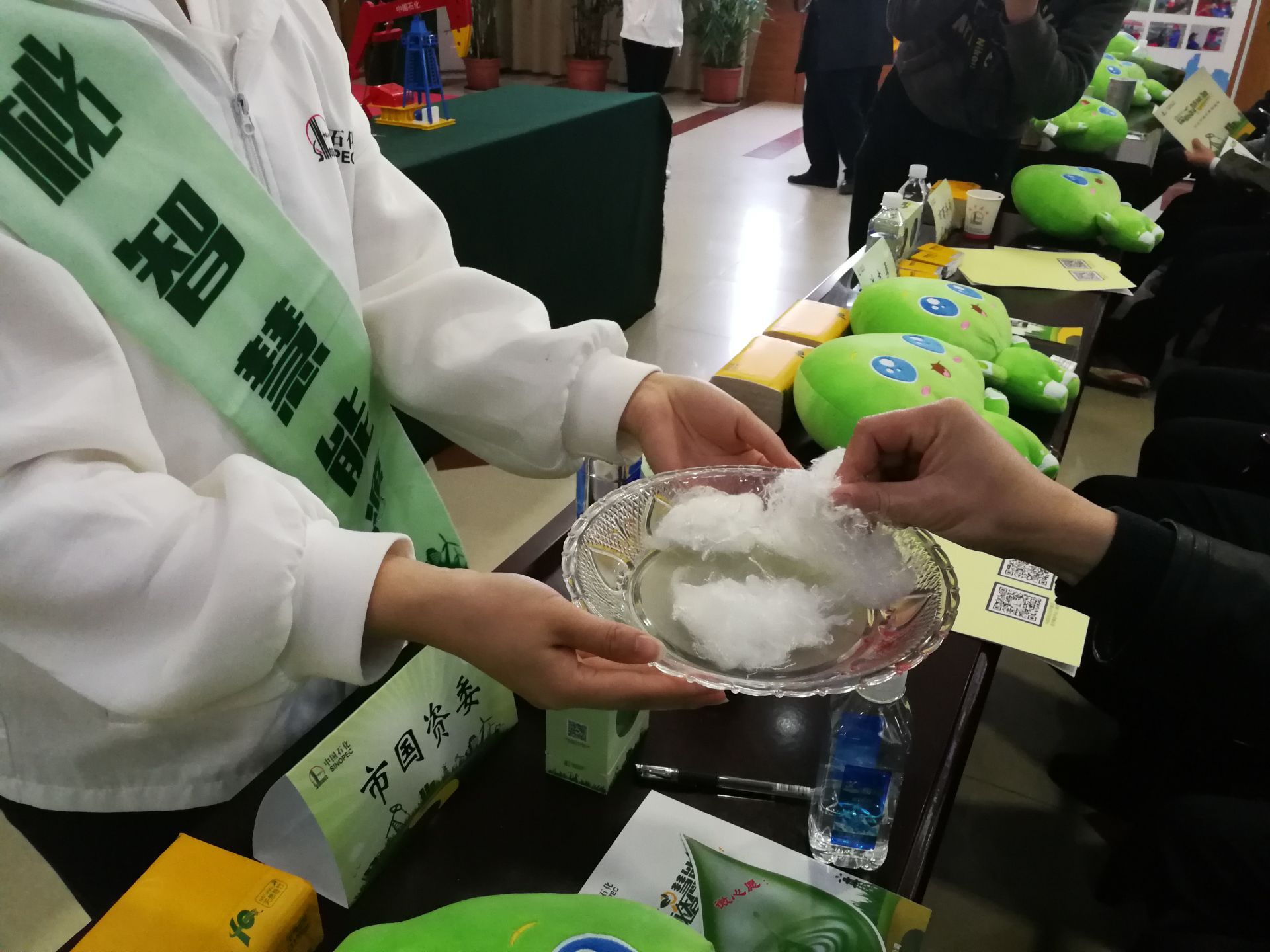 圖:咸寧社會(huì)公眾代表用手觸摸一種由石油制成可溶于水的新纖維。