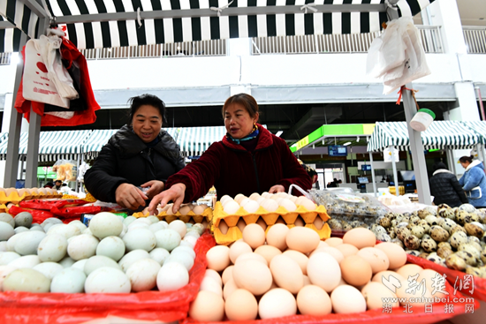 在肉類攤位前,剁了20多年肉砧板的胡金山割肉的手麻利多了——他邊賣肉,邊招呼顧客,今天喜遷新市場,瞧這秤也足足的。排著長隊購買“兩頭烏”豬肉的顧客不時盯著屏幕上中央電視臺拍攝采訪這位養(yǎng)豬大戶的專題片,有的掃一掃二維碼,看養(yǎng)豬場實況。